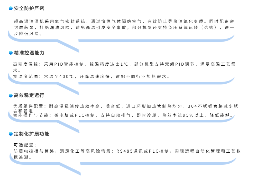 油温机以导热油为介质,通过储油箱、循环泵、加热器及温控系统构成闭环回路:工作时导热油经循环泵打入被控温设备(如模具、辊筒反应釜),再返回系统完成热量交换,通过pid温控或plc控制实现常温至最高400℃的精准控温(±1℃)
