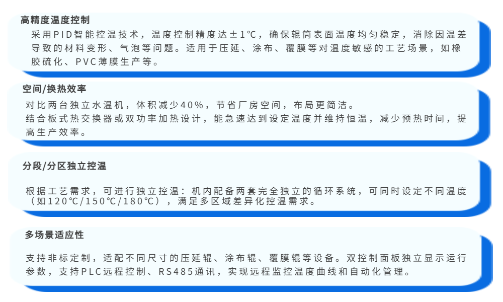 多机一体水温机是一种集成化温控设备,通过将两套独立的温度控制系统整合在单一机架内,实现对不同区域或设备的精准温度控制。